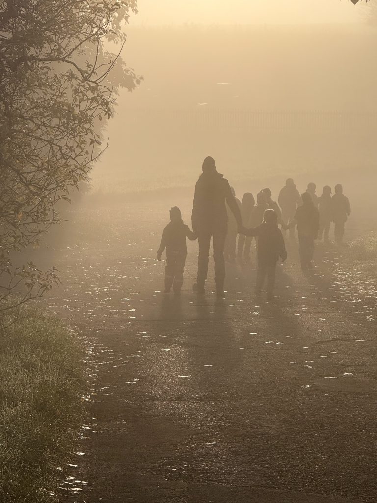 Gegen 8.30h haben wir uns vom Kindergarten aus auf den Weg gemacht, und da es in der zweiten Woche teilweise nur 0 grad am Morgen hatte, haben wir auch schon mal den ein oder anderen Umweg genommen um uns ein wenig länger 'warm' zu laufen. Meist belohnte uns der Tag dann aber mit einem wunderschönen Sonnenaufgang und auch in der Woche der Vorschulkinder sind wir eigentlich nur einmal in den Regen gekommmen. Wir können uns also wirklich nicht beklagen. Auch die Großen hatten Spaß beim Rutschen, beim Neuaufbau der Waldtippis und beim Menschenmemory...