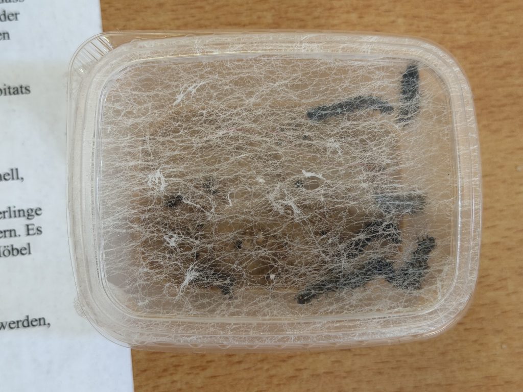 Zur Zeit leben unsere Raupen in einem Becher im Flur unserer Kita, wo sie von allen Kindern immer wieder gerne beobachtet werden. Der 'Sand' am Boden des Bechers ist das Futter der Raupen. Seit ihrem Einzug vor ca. eineinhalb Wochen haben die Raupen schon richtig gut zugenommen und es sieht so aus, als würde es nicht mehr lang dauern, bis sie sich verpuppen. Sobald alle Raupen ihren Kokon gebaut haben, werden sie in ein Schmetterlingsnetz umsiedeln und wir hoffen, dass wir dann bald sieben wunderschöne Schmetterlinge in der Natur freilassen dürfen.